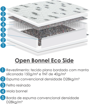 Colchão face dupla de mola bonnel com espuma certificada e revestimento em tecido poliéster bordado com 24cm de altura.