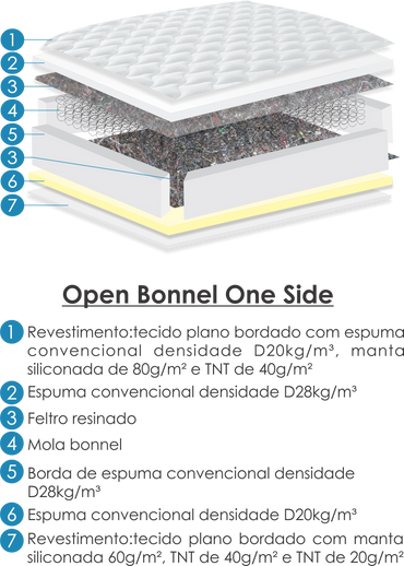 Colchão face única de mola bonnel com espuma certificada e revestimento em tecido de primeira linha Jacquard com 25cm de altura.
