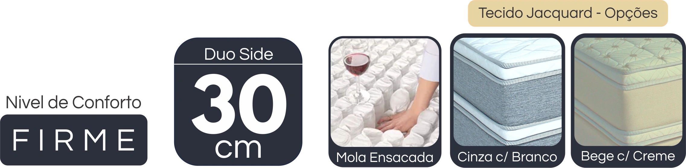 Colchão face dupla de molas ensacadas com espuma certificada e revestimento em tecido de primeira linha Jacquard com 30cm de altura.
